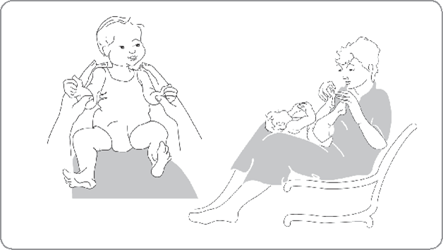In de eerste maanden kunt u een gewone kinderwagen, buggy of auto-stoeltje gebruiken. Het is wel belangrijk dat u uw kind regelmatig op schoot neemt, omdat u zittend op schoot spelenderwijs balansreacties kunt stimuleren (zie afbeelding 5 en 6). Deze zijn later weer belangrijk voor het leren omrollen, tijgeren of kruipen.