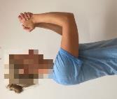 - De eerste 3 maanden heft u de arm NIET zijwaarts gecombineerd met de onderarm naar achteren draaien. Het kapsel van de schouder heeft tijd nodig om te herstellen, bij deze beweging is er een verhoogd risico dat de schouder weer uit de kom gaat (zie afbeelding 3).