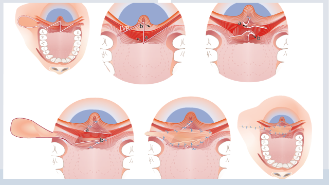 • De huig langer maken door verplaatsen van weefsel in de huig (Furlow plastiek).