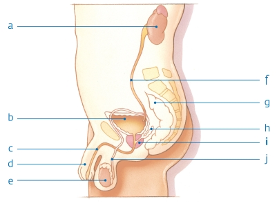 Figuur I: Ligging van de prostaat (illustratie: KWF). a=nier, b=blaas, c=plasbuis, d=penis, e=zaadbal, f=urineleider, g=endeldarm, h=zaadblaasjes, i=prostaat, j=zaadleider