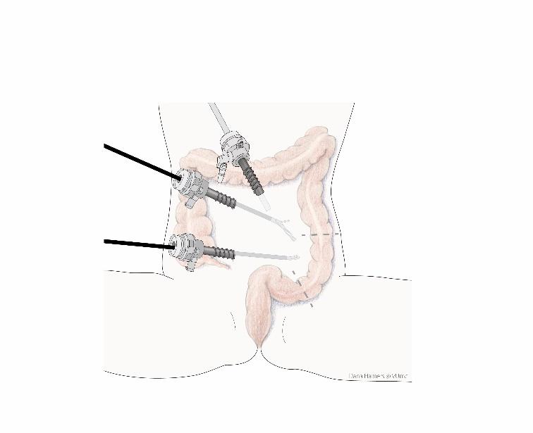 Vervolgens wordt via dezelfde snede een camera ingebracht en twee extra sneden gemaakt om werkinstrumenten te kunnen inbrengen.