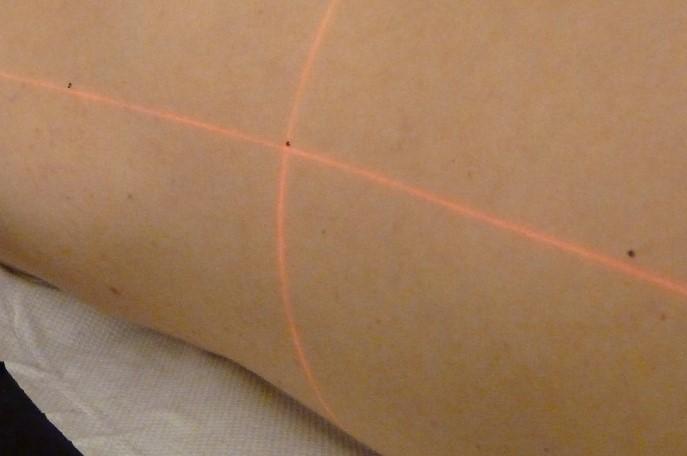 De radiotherapeutisch laborant zal ook een aantal tatoeage-puntjes op uw lichaam aanbrengen. Deze puntjes zijn nodig om u later op het bestralingstoestel in de juiste houding te kunnen leggen.