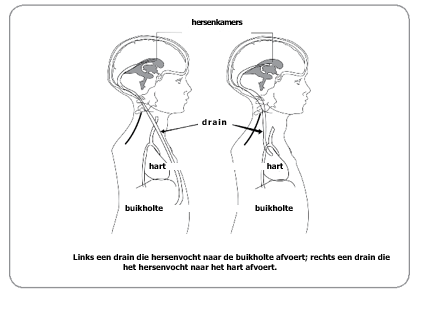 Om een hydrocefalus te behandelen plaatst de neurochirurg een drain. Dit gebeurt tijdens een operatie. Dit is te vergelijken met een slangetje met daarin een klepje (drukventiel). Het slangetje voert het overschot aan hersenvocht af, van de hersenkamers naar de buikholte (of heel soms naar een andere lichaamsholte).