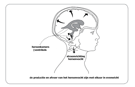Het hersenvocht wordt geproduceerd in de hersenkamers (ventrikels). Van daaruit wordt het afgevoerd naar de ruimten rondom de hersenen en het ruggenmerg. Vervolgens wordt het hersenvocht weer opgenomen in het bloed. Normaal gesproken zijn de productie en de afvoer van het hersenvocht met elkaar in evenwicht. Zie deze afbeelding.