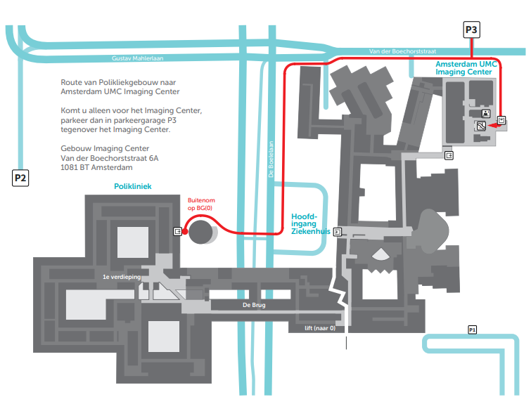 Looproute van de polikliniek naar het gebouw van het Amsterdam UMC Imaging Center, Van der Boechorststraat 6 A.