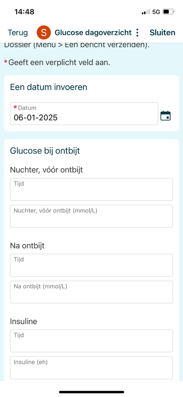- Vul de glucosewaarden, insulinewaarden en eventuele opmerkingen in.