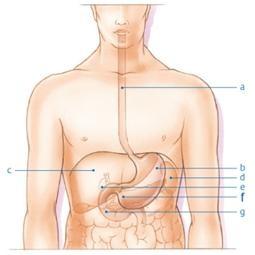 Figuur 1: (A) slokdarm (B) maag (C) lever (D) milt (E) galblaas (F) alvleesklier (G) dunne darm © 2013 KWF Kankerbestrijding