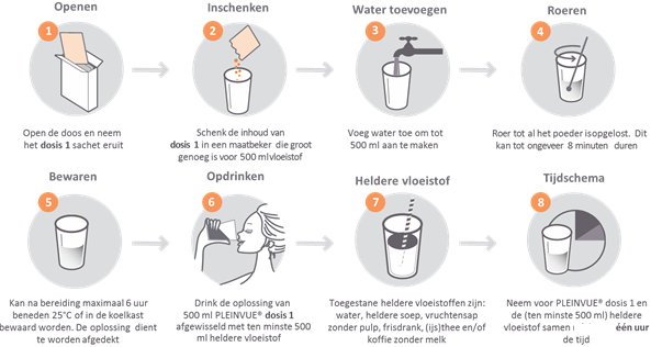 start u met de inname van halve liter Pleinvue ® zoals hieronder beschreven. Na de inname van Pleinvue ® neemt u ten minste nog een halve liter van het helder vloeibare dieet, zoals hieronder beschreven. Zorg dat u de Pleinvue ® en nog een halve liter vocht rond 19:00 uur heeft opgedronken. |