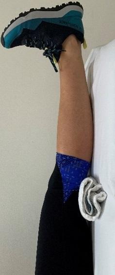 Zit op het puntje van een stoel. Leg een handdoekje op de vloer. Zet u voet op het handdoekje en schuif deze over de vloer rustig naar voren en naar achteren. Houd deze buiging van de knie een paar seconde vast en schuif de voet weer een stukje naar voren. Herhaal deze beweging. Het doel is dat de knie soepel wordt en in een hoek van 90 graden kan bewegen. Herhaal de oefening 10 keer.