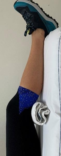 Ga zitten met uw aangedane been gestrekt. Strek de knie volledig zodat de knieholte in de bank drukt. Span de buikspieren aan, buig de voet naar u toe en til het been op. Belangrijk is dat de knie helemaal recht blijft. Herhaal de oefening 10 keer.