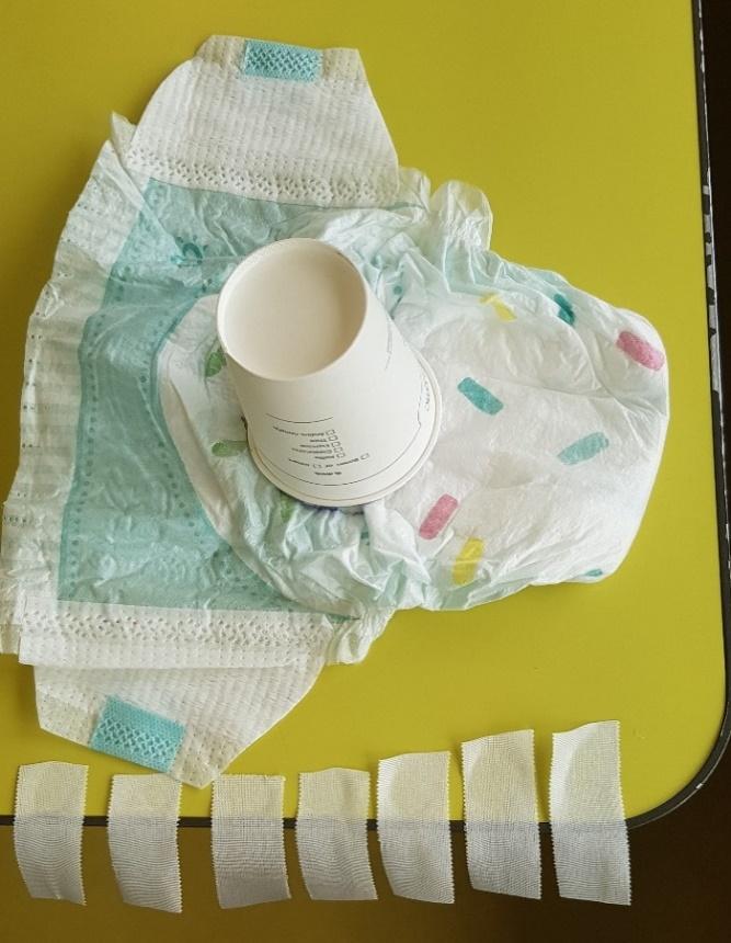 Twee luiers, schaar, pen of stift, bekertje of limonadeglas, rolletje pleister(wordt verstrekt via dagziekenhuis).