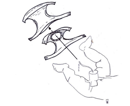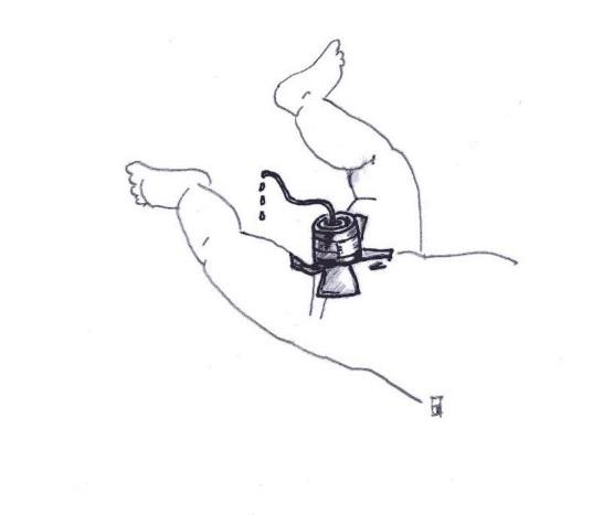 Doe deze luier bij uw zoon om. De schuimtoeter en het kathetertje moeten door het gat naar buiten steken. (Het bekertje stelt hier het schuimverband voor)