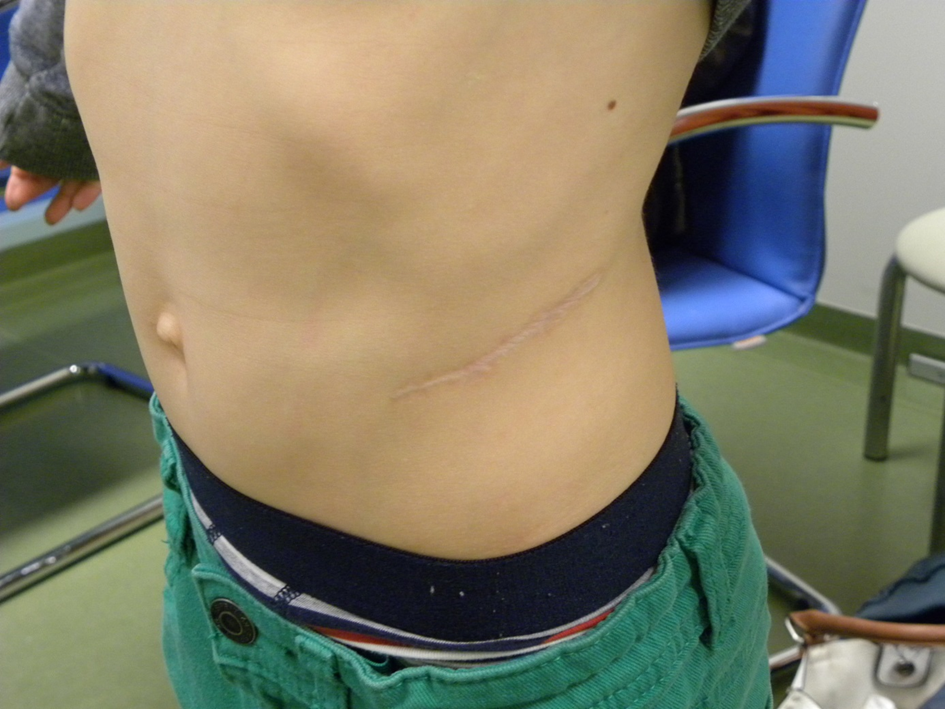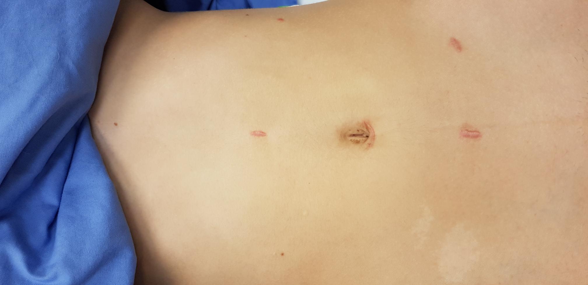Links: littekens van robot geassisteerde operatie. Rechts: litteken van lumbotomie (meestal aanzienlijk kleiner dan op deze foto)