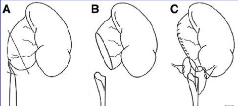 A: verwijdering van een deel van het uitgerekte nierbekken en de vernauwde overgang van nierbekken naar urineleider. B Voorbereiding om een nieuwe, ruime verbinding te maken. C: Sluiten van het verkleinde nierbekken en maken van de nieuwe verbinding met de urineleider. (afbeelding: researchgate.net)